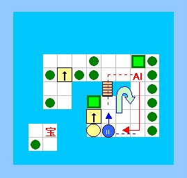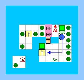 (5) 立ち止まらずに、外周を伝う形でスネーキーの右隣へ行き、 それを玉子にして左に2歩押します。 そうしたら、立ち止まらずにまた上へ行きます。 |