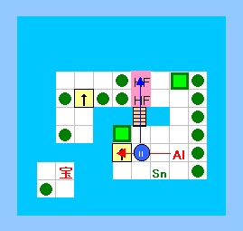 (6) 橋を渡って右端を回ってきてから、 矢印パネルのところへ行き、そこから玉子を押して船出します。 このとき、アルマには追いつかれずに済む・・・と思います。 |