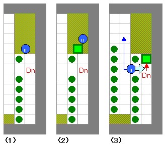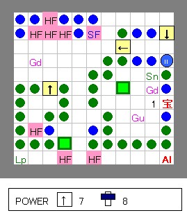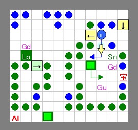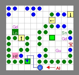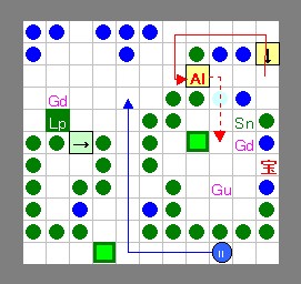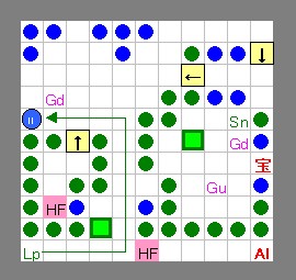 7. さらに待つと、アルマは右上をぐるりと回り、矢印[←]を通過します。 この矢印[←]にアルマが触れると同時に上へ進み、 岩を壊した地点の右上のマスへ行って下さい。 |