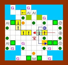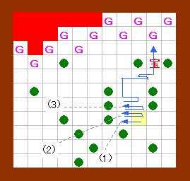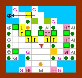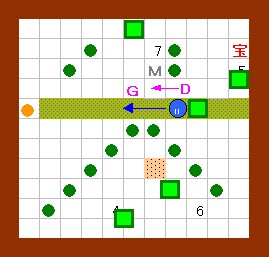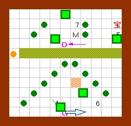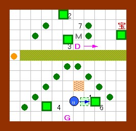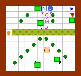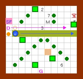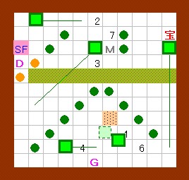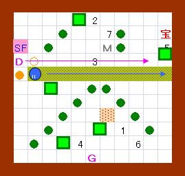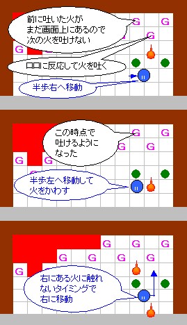その作業の際には、右から3のゴルが吐く炎が邪魔になりますが、 このゴルは手順4の時点で一度炎を吐いているので、 それが画面上に残っている(次の炎を吐かない)間に作業すればよいことになります。 このことをまとめると左図のようになり、 左図の歩行経路を文章で書くと、上記の手順6以降の内容になります。 この図の行動が実践できるように、練習してみて下さい。 |