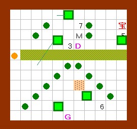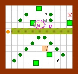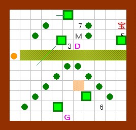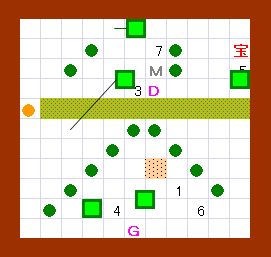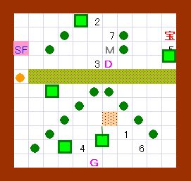 ドンメドーサに注意しながら、玉子にしたゴルを 図の場所へ移動し、EFでホール1と6を塞いでから 玉子を吹っ飛ばします。ゴルはホール7に出現します。 |