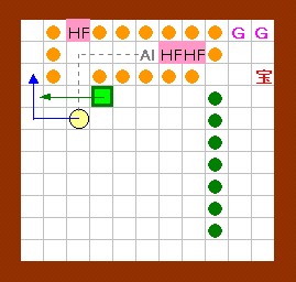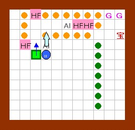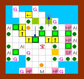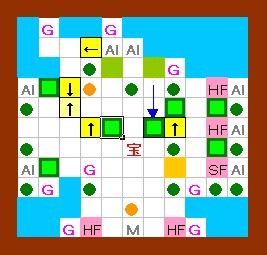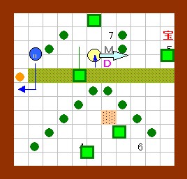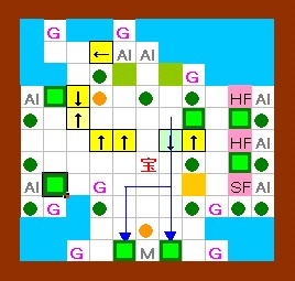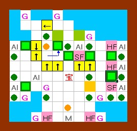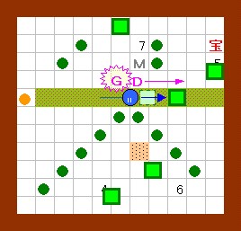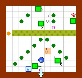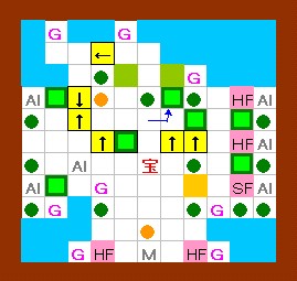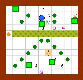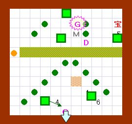 上の解答と同じように進めます。 その後、ドンメドーサを画面の右半分の範囲に追いやるのですが、 その時にEFを置く場所をホール3の半歩左上ではなくて、 ホール3の1歩左・半歩上にします。 左上のハート回収と最上段のEF移動は上の解答と同じように行って下さい。 |