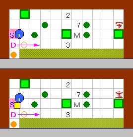 この解答では、最後の手順でEFを押しながら進む必要がありません。 また、ドンメドーサが画面の右端まで進んでこないようになっています。 そのため、右上のマスに行くときのタイミング調整に余裕ができ、 たどりついた後はそこで悠々と休憩できます。 しかもショットが2発余るということで、見所の多い内容となっています。 |