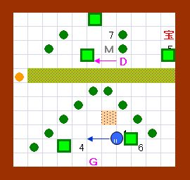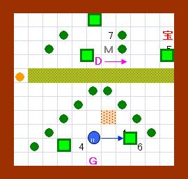 ドンメドーサと並行に右端まで行きます。 自分がドンメドーサよりも右に半歩分、先行するように進むと メドーサの視線は受けません。 |