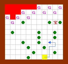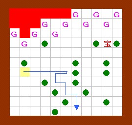宝箱のところまで行ければクリアです。 何度も火をかわしながら少しずつ慎重に進んでいけば 宝箱へ行くことができますが、それが面倒な方は左図のルートを 使って下さい。途中で立ち止まらずに一気に駆け抜けると、そのまま宝箱へ行けます。 |