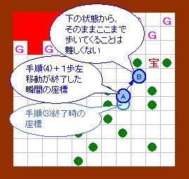 [補足] 上記の一連の手順について、手順4以降の状況の イメージが掴めないと思うので、 補足を付けます。 手順4からさらに左へ1歩移動した状態を(A)とすると、 その座標は左図のようになります。 ここへ来たとき、間髪入れずにさらに歩行して (B)の地点へ行くことは、さほど難しくありません。 そのときの移動経路は、上の説明だと手順5に相当しますが、 他の経路を通っても(B)に行けることがあります。 この後が問題です。そのまま宝箱へ歩いていったら、真正面から ゴルの炎を浴びて死んでしまいます。 では、どのような状況を作れば宝箱へ行けるのでしょうか? |